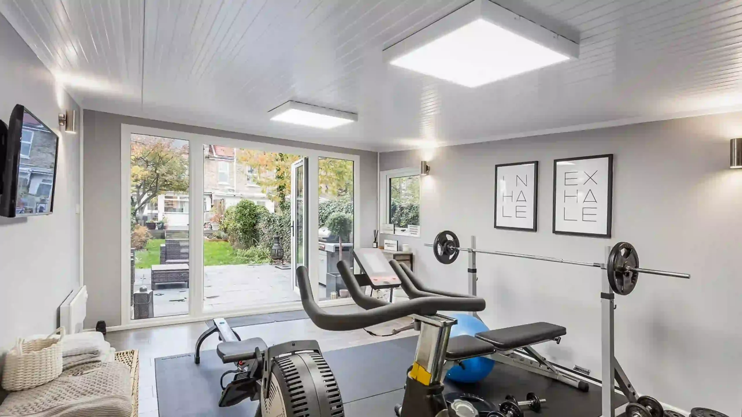 Proper lighting & Good ventilation complete the space, organized storage & clean surfaces maintain a professional look. A stylish home gym supports consistency and long-term motivation.